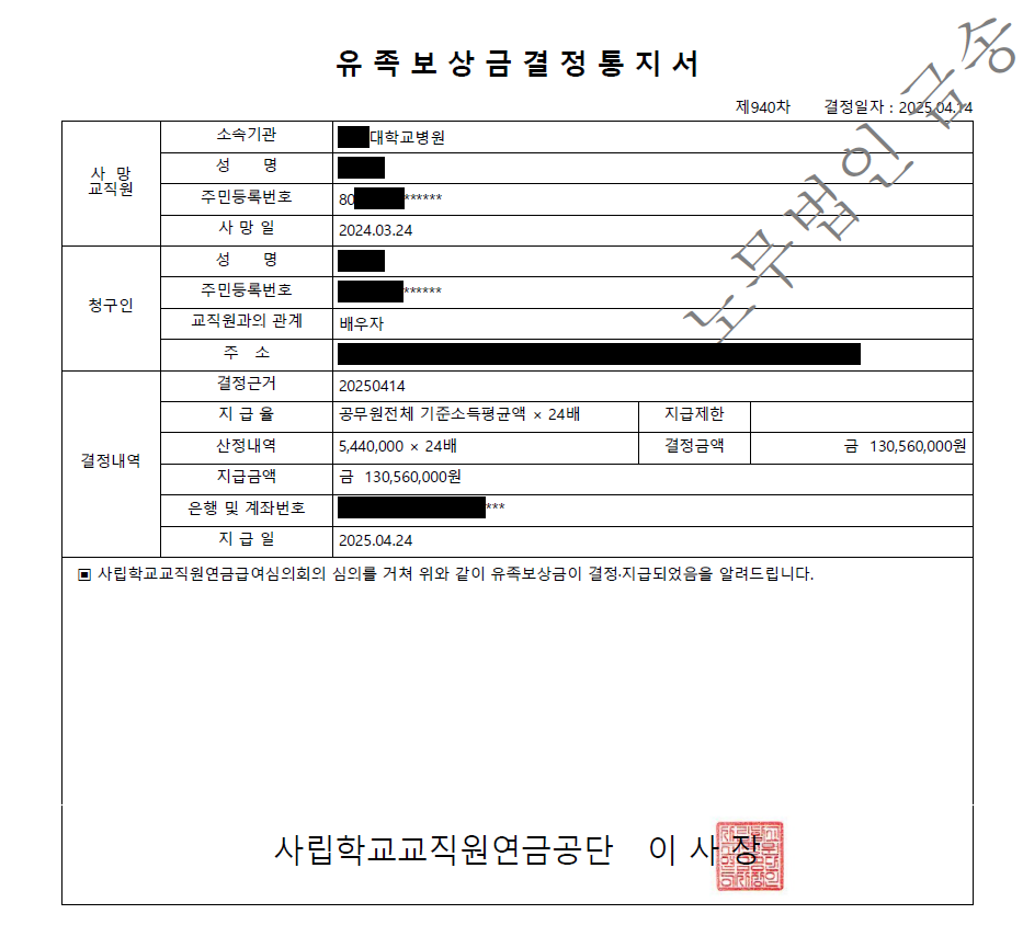 급성 심근경색으로 과로사 한 병원 당직 의사의 유족 연금 청구 승인 사례
